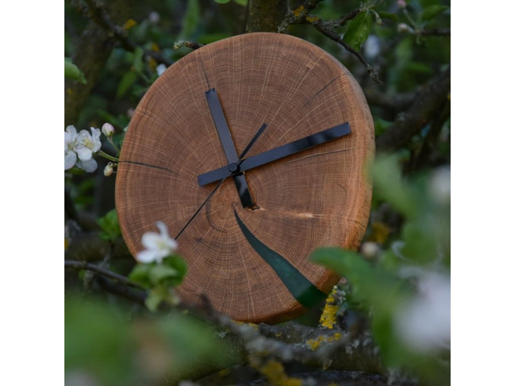 Tyto hodiny spojují minimalistický design s krásou přírodního dřeva. Dubový masiv je pečlivě opracován a doplněn epoxidovou pryskyřicí v tmavě zeleném tónu, který hladce navazuje na texturu dřeva.
