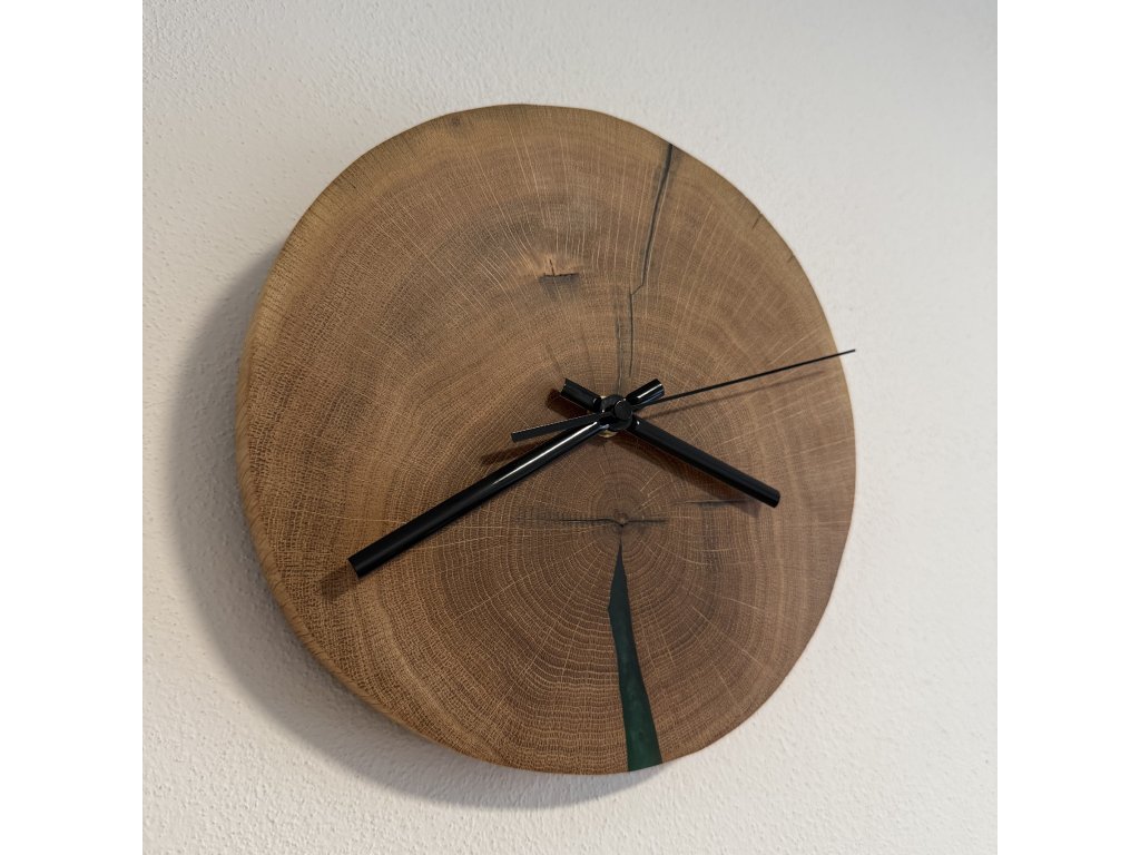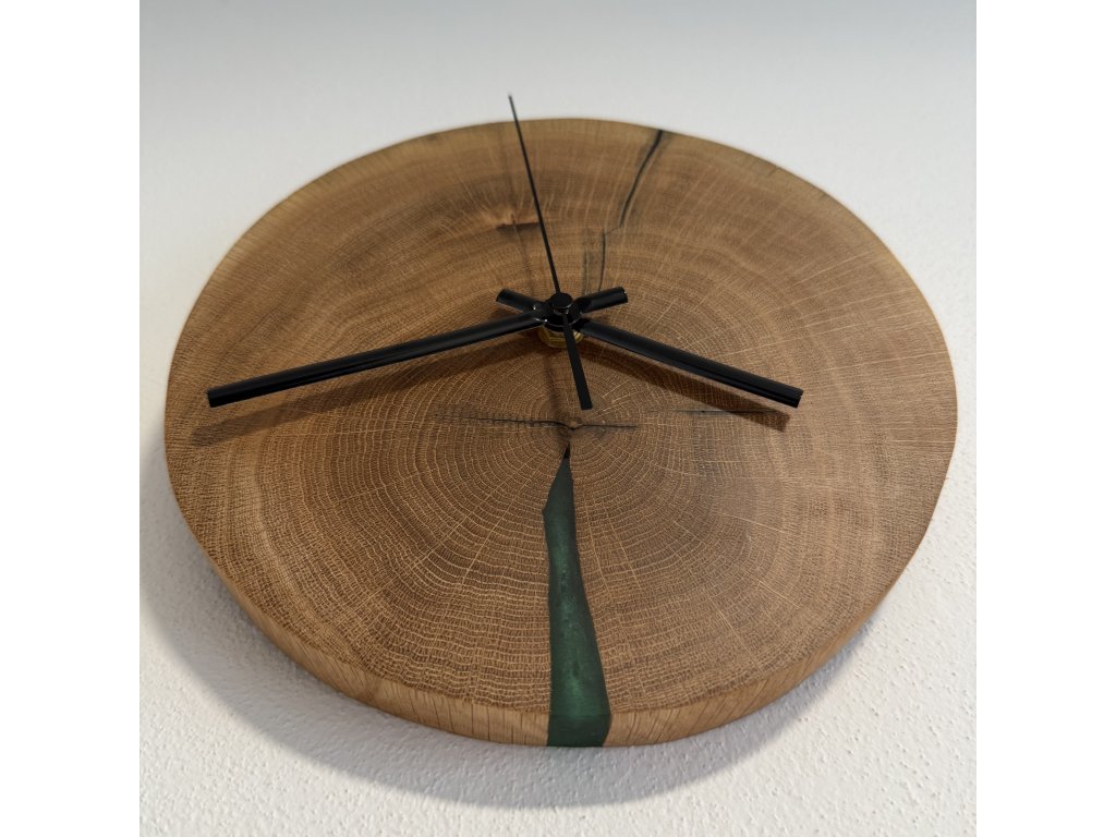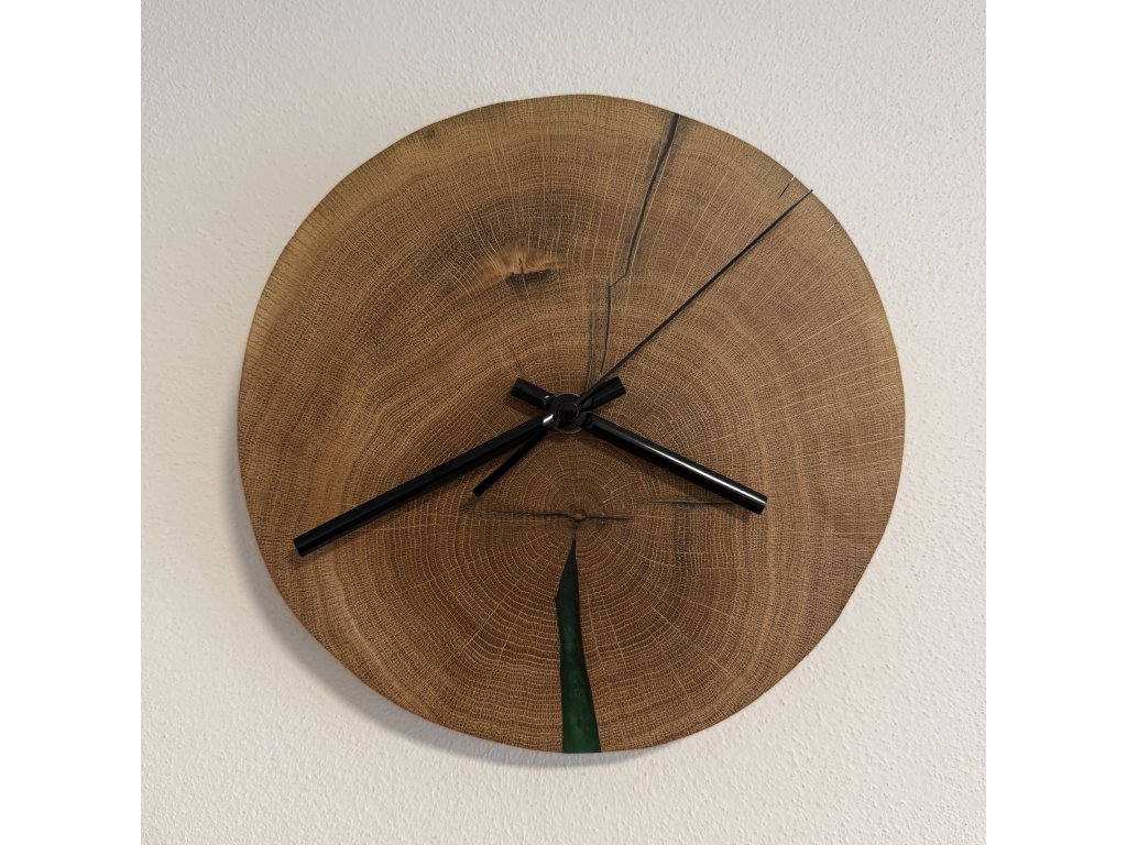 Tyto hodiny spojují minimalistický design s krásou přírodního dřeva. Dubový masiv je pečlivě opracován a doplněn epoxidovou pryskyřicí v tmavě zeleném tónu, který hladce navazuje na texturu dřeva.