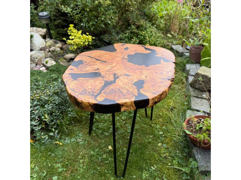 Unikátní stolek z olivového dřeva doplněný matným černým epoxidem. Silný kontrast a přirozená krása tvoří jedinečný designový kus.