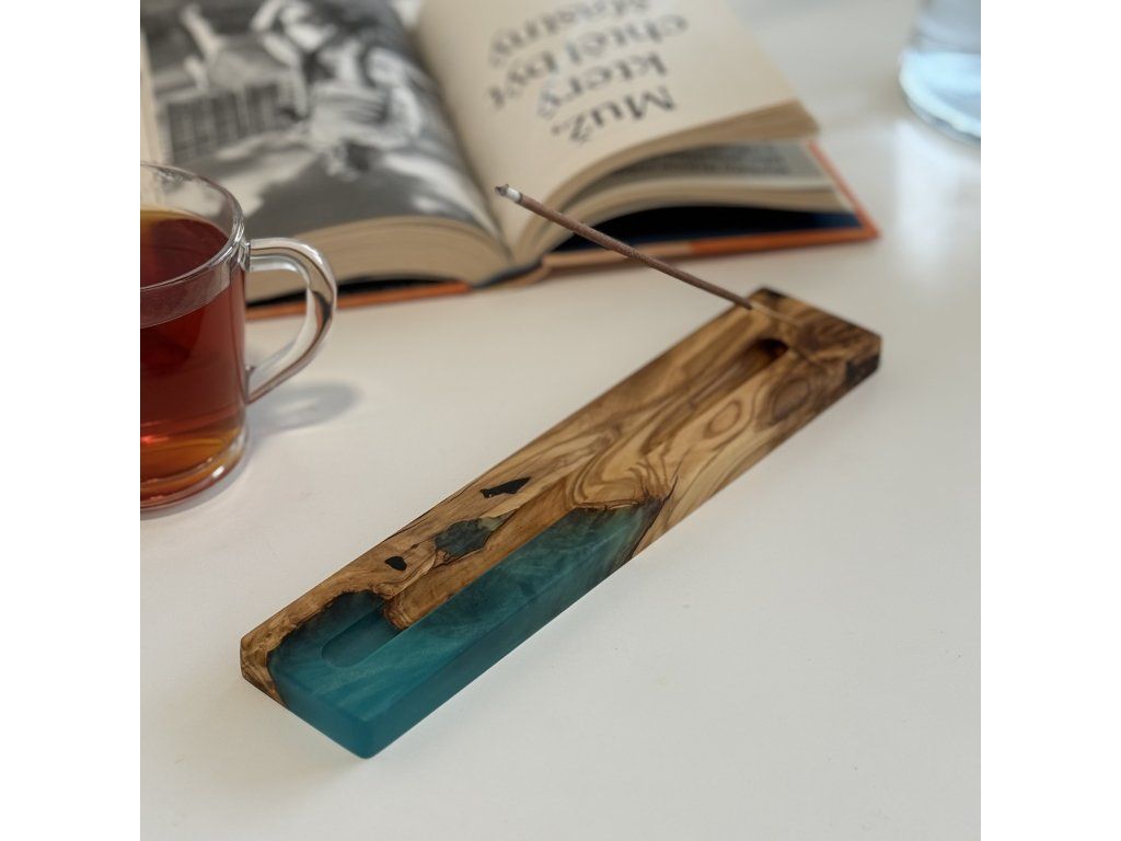 Designová „lodička“ na vonné tyčinky z olivového dřeva a epoxidu, která spojuje přírodní kresbu s moderním barevným akcentem. Vyfrézovaná drážka zachytává popel a zajišťuje čisté použití, zatímco tyčinka se jednoduše zasouvá do přesně vrtaného otvoru. Každý kus je originál a zároveň stylový doplněk pro chvíle klidu a relaxace.