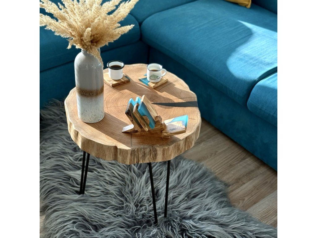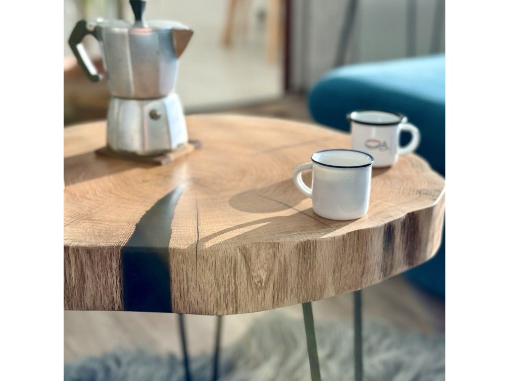 Masivní dubový odkládací stolek s autentickou strukturou letokruhů, která vypráví příběh samotného stromu. Výrazná prasklina zalitá černým matným epoxidem dodává stolku osobitý charakter a moderní kontrast. Přirozený tvar desky zachovává syrovou krásu dřeva a dělá z každého kusu originál.